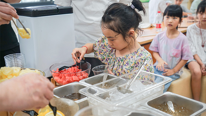 炎炎夏日,一杯午后的茶饮消除了些许疲惫。参观过后,孩子们在家长的陪伴下开启了果茶创意DIY。一双双勤劳的小手,将不同的水果、食材搭配在一起,制作出了一杯杯令人垂涎欲滴的新鲜果茶。