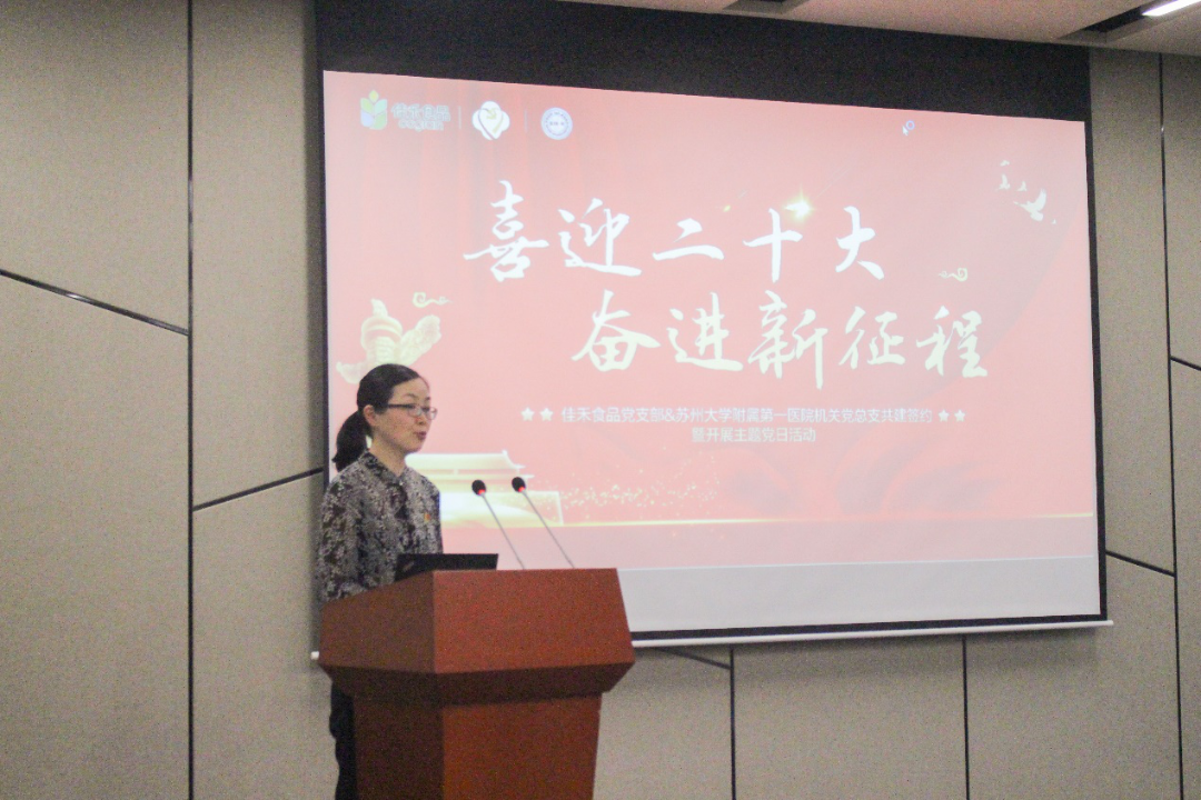 公司常务副总裁柳新仁在致辞中表示,此次活动旨在创新“党建+”工作新模式,搭建党建活动新平台,加强医企单位党支部之间的交流互学、联合共建,提高党建理论水平和工作水平,进一步推动党员学习交流走深、走实。此次党建共建活动不仅是佳禾食品深入贯彻落实党的十九大精神、创新非公企业党建工作的有益尝试,也是与苏大附一院共同巩固、深化全面合作关系的重要契机,更是双方面向未来、携手共进、协力共赢的有力举措。